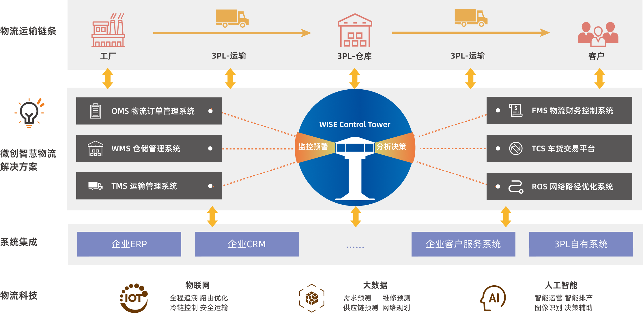 微创智慧物流平台区别于传统物流管理系统,通过物流控制塔实现物流全程可视化,实现客户需求指导订单与生产计划自适应的供应链体系。通过数据沉淀与再运用,帮助企业进行商品流通预测,以此科学选址建仓,重塑物流网络与资源布局,利用真实有效的订单服务数据,指定生产排期与采购计划,建立自适应供应链体系,通过对运输车辆的安全合规服务质量认证,实现车货交易的有效撮合,提高车辆运载能力,降低运输成本,实现物流信息互联互通,提升产业链协同效率。