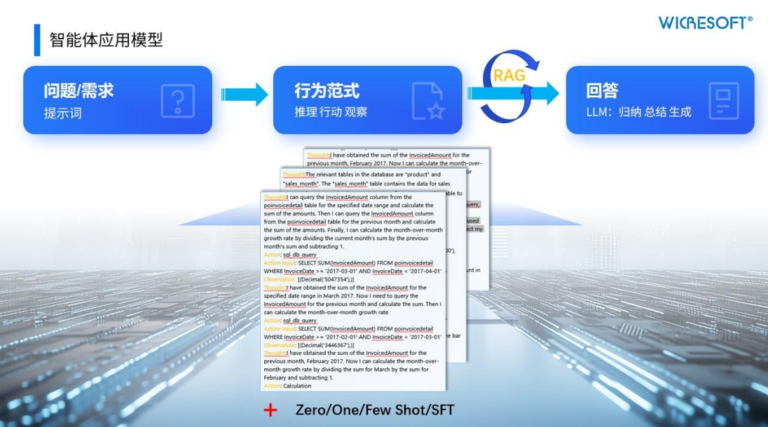 贾晓在演讲中进一步通过实际应用案例阐释了微创软件ABI产品的操作便利性和智能化特性。“设想一位销售总监,急切需要了解某个产品在2023年9月份的销量排名。借助我们的ABI产品,他只需拿出手机,通过微信直接提问,即刻便能获取任何时段、任何商品的销量数据。”他继续解释了产品背后的智能化原理:“我们的AI智能体,按照既定的思维方式和行为规范定义,装备了先进的工具,能够进行思考、行动、观察和推理。” 贾晓强调,智能体的这一过程得益于大模型的能力,它能够增强并生成深入的分析和见解。“这不仅仅是技术的突破,更是用户体验的革新。” 贾晓总结道。通过这样的智能化应用,在工作中不仅简化了数据分析流程,还极大地提升了用户获取信息的效率和便捷性,从而在商业决策中发挥了关键作用。