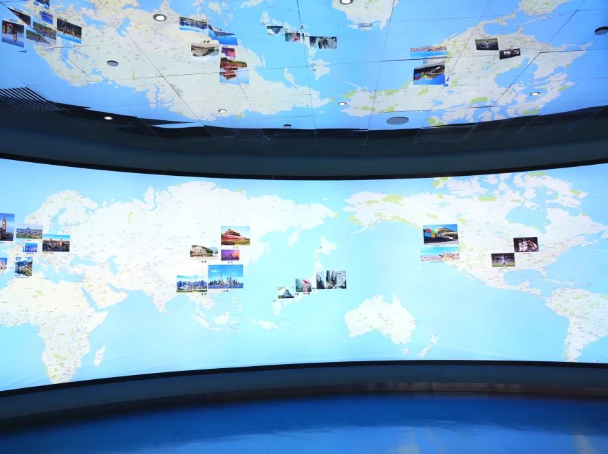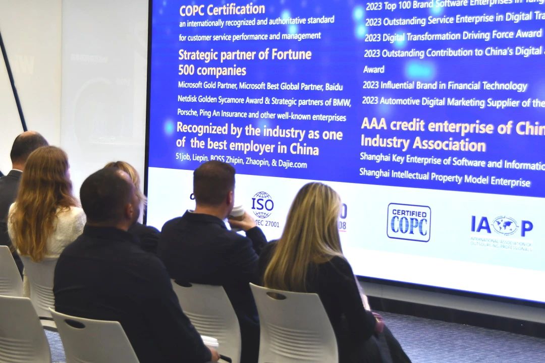 代表团首先步入展示微创软件全球版图的区域,那哲总经理系统介绍了公司的历史演进与 “GO BIG GO BEYOND” 全球化发展战略。微创软件于全球多地设有分支机构,在中国、美国、日本、英国、德国、瑞士、西班牙等地区布局 36 处交付中心,拥有来自74个国家的一万两千余名员工,其广泛的全球网络彰显出强大的国际业务布局能力,使代表团直观感知到微创软件的企业规模与全球业务覆盖广度。